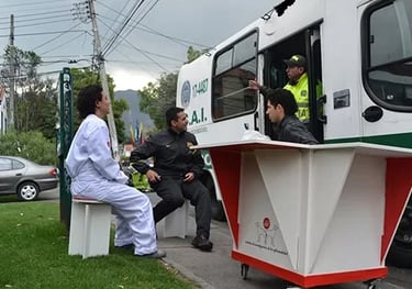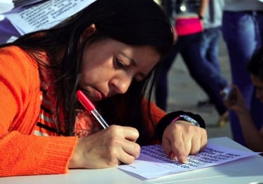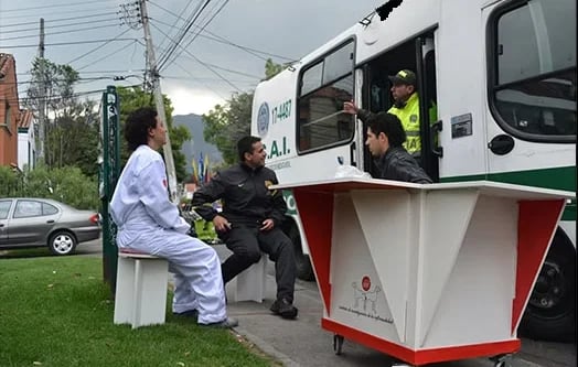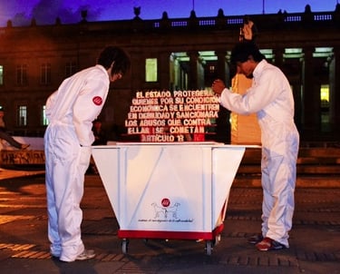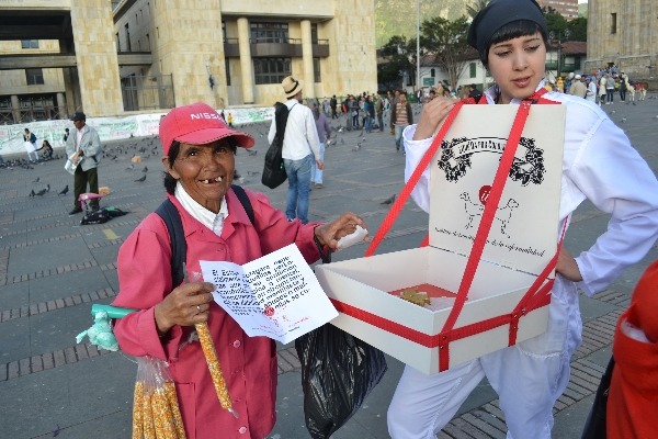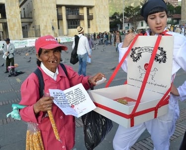 Collaborating with vendors who sell legal rights books outside courthouses, we recite Colombian Constitution articles about democracy and equality. We're also working with minority groups to create new constitutional rights.