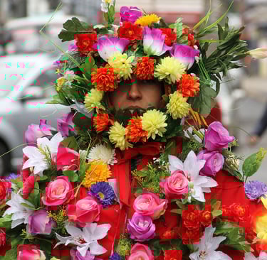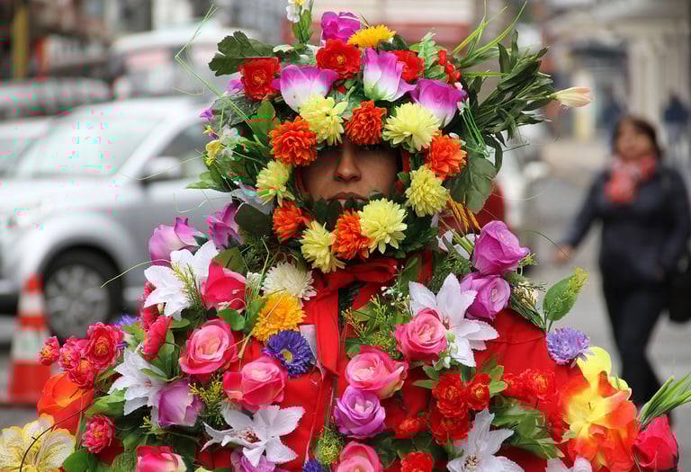 FLC's interpretation is a performance featuring a woman in a custom suit made entirely from bright plastic flowers sold at Chilean altars. These artificial blooms, manufactured in China and shipped to Chile, represent the superficial and hollow nature of the so-called Chilean Miracle—beautiful on the surface but lacking real substance or roots.
